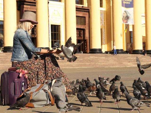 Обои Молодая девушка кормит голубей на вокзале