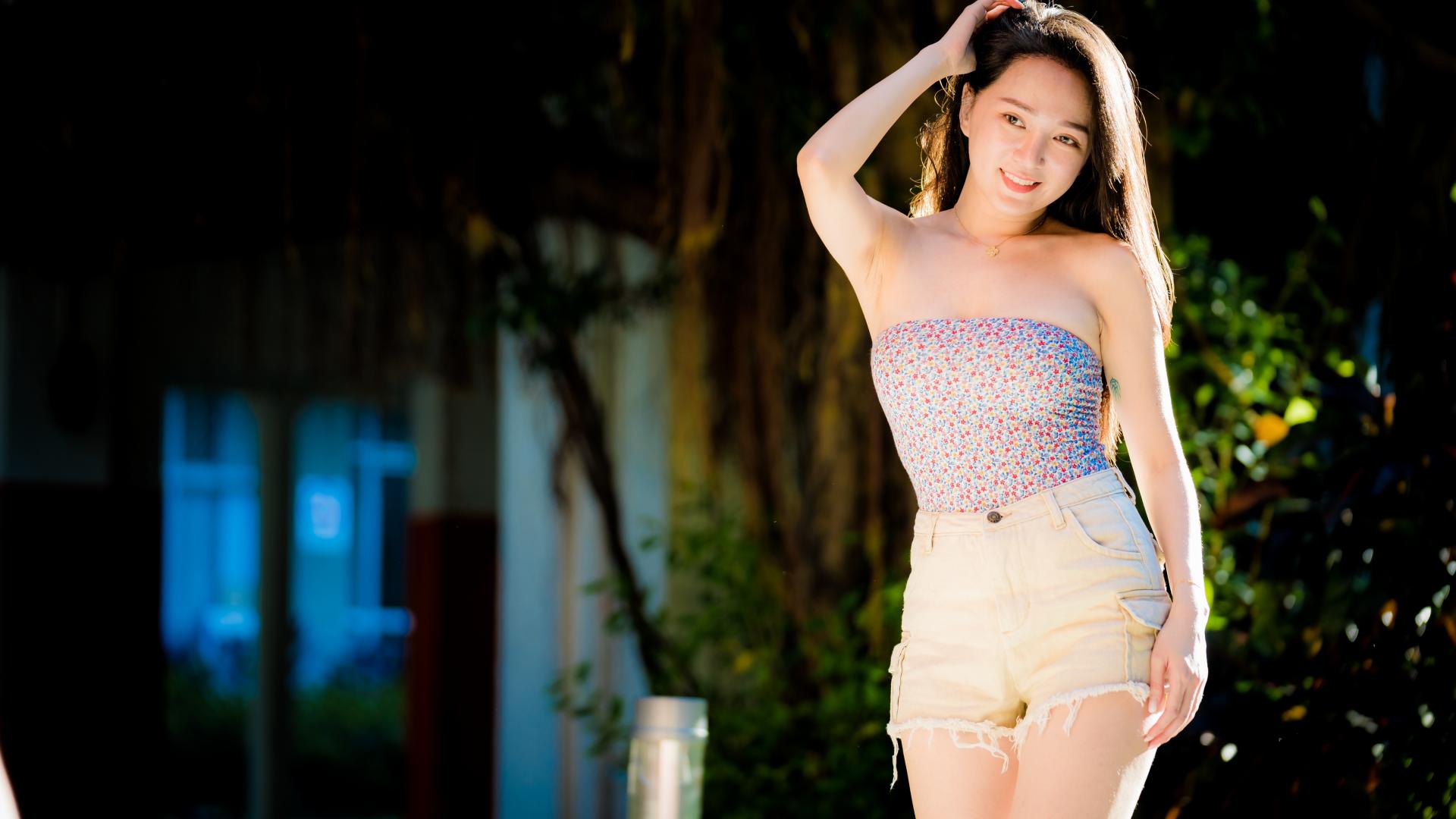 Обои Молодая азиатка в шортах в лучах солнца