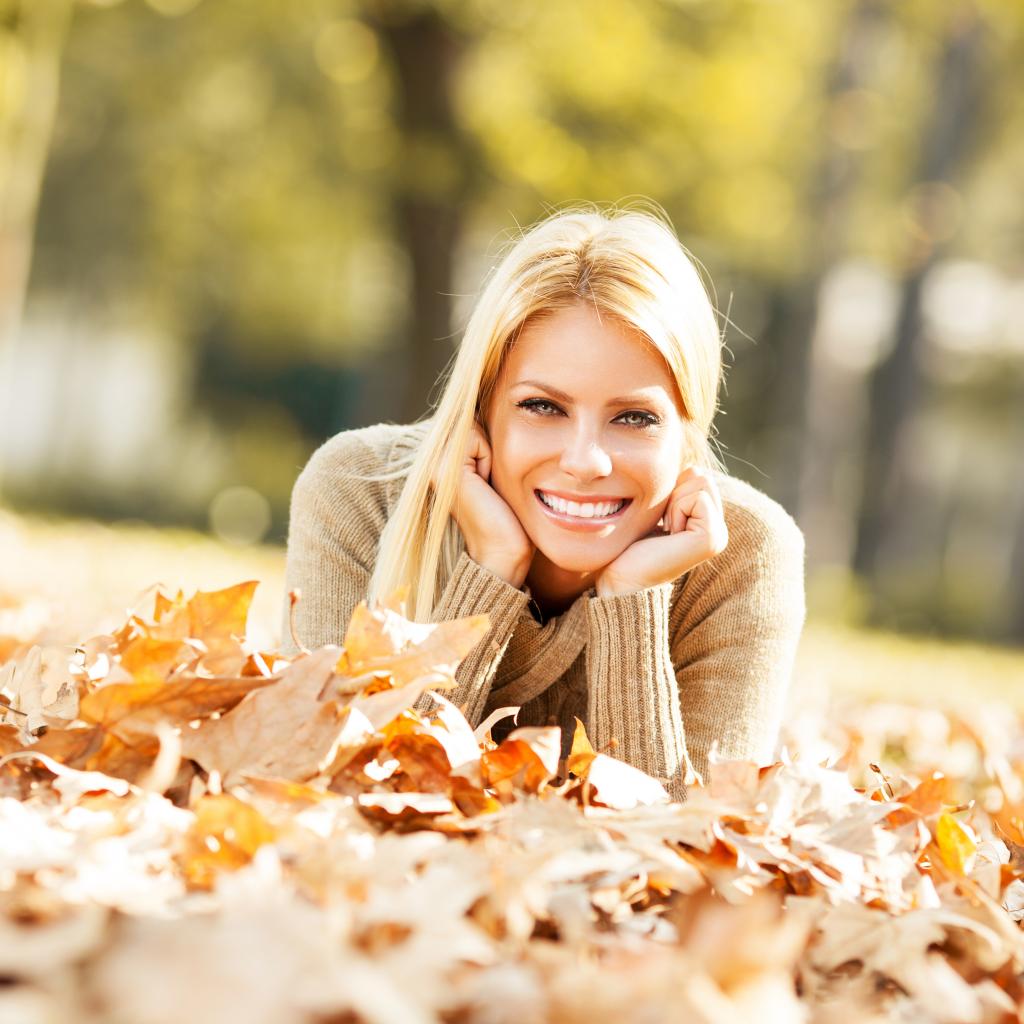 Обои Улыбающаяся девушка лежит на сухой опавшей листве