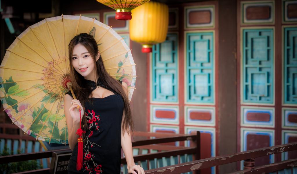 Обои Красивая девушка азиатка в черном платье с зонтом