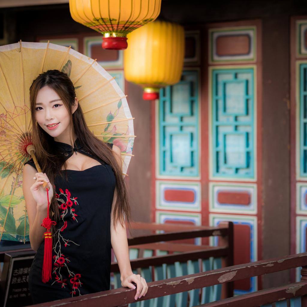 Обои Красивая девушка азиатка в черном платье с зонтом