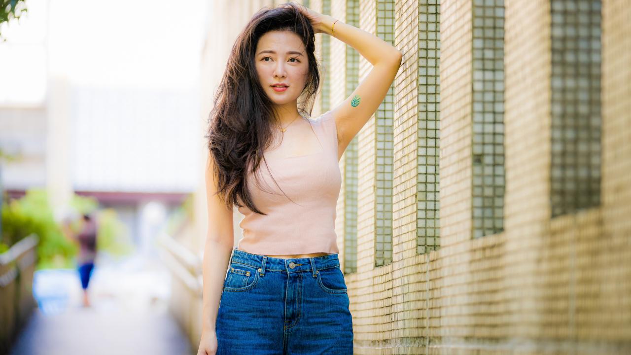 Обои Молодая азиатка с длинными волосами в синих джинсах