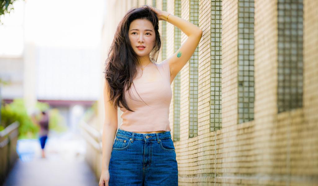Обои Молодая азиатка с длинными волосами в синих джинсах