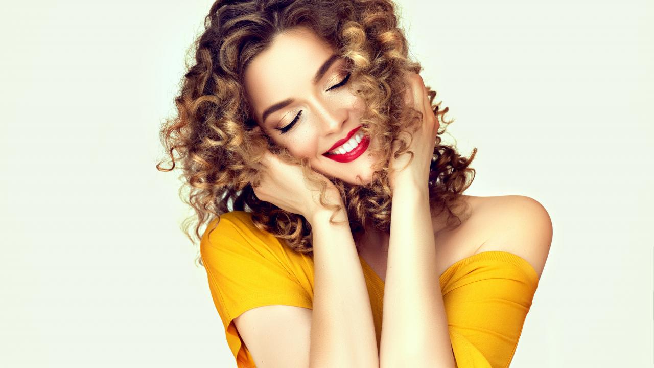 Обои Улыбающаяся девушка с закрытыми глазами на белом фоне