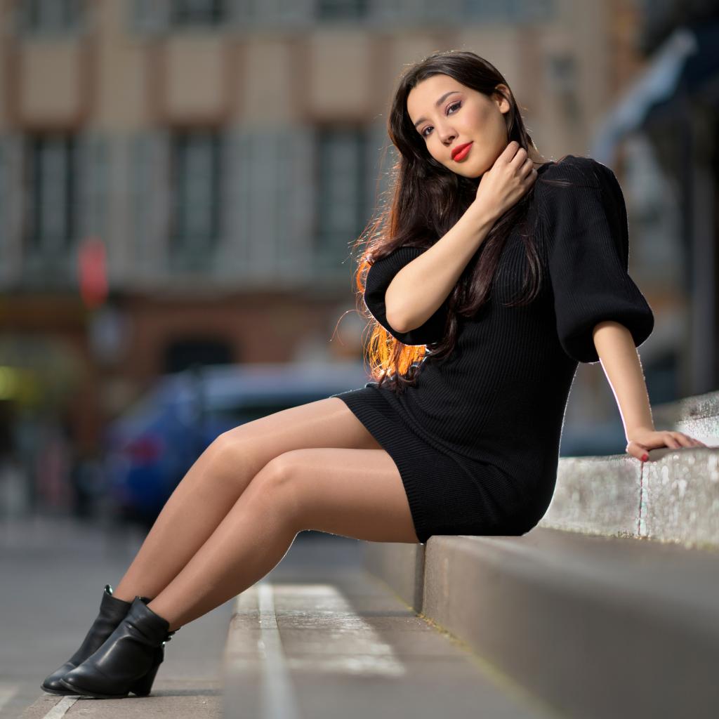 Обои Красивая девушка в черном платье сидит на ступенях