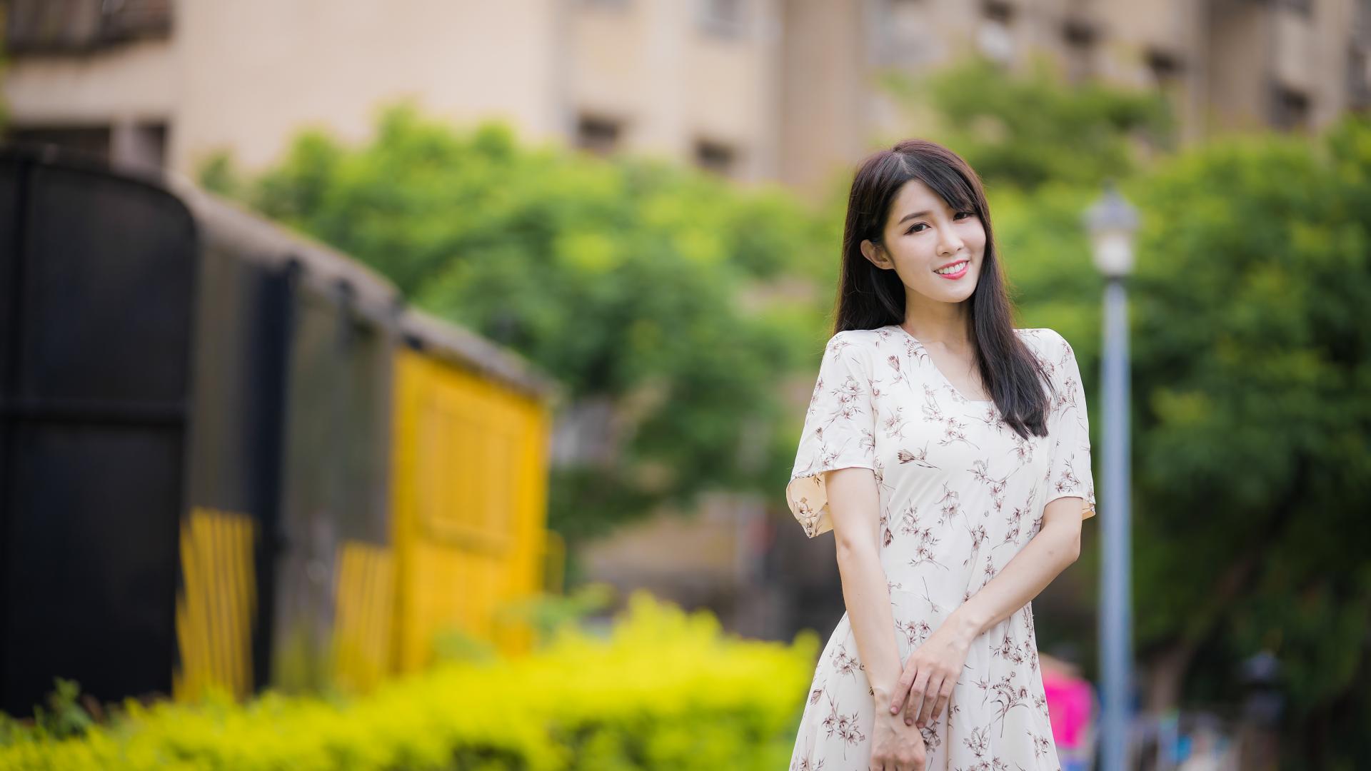 Обои Нежная улыбающаяся азиатка в красивом платье