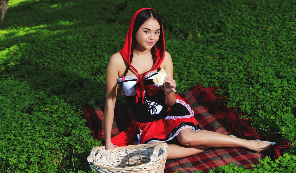 Обои Молодая девушка в костюме сидит на траве, косплей