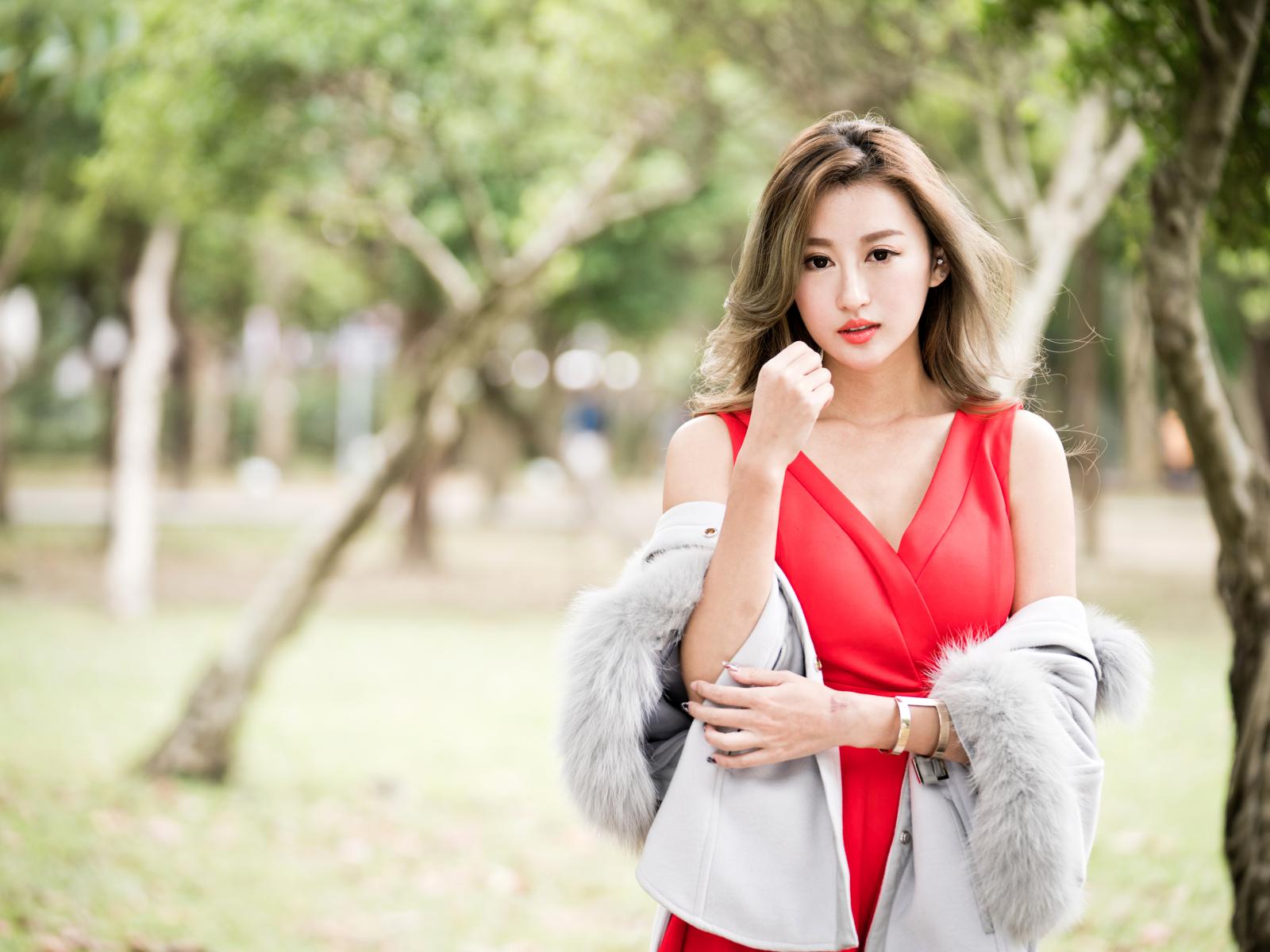 Обои Красивая азиатка в красном платье в парке