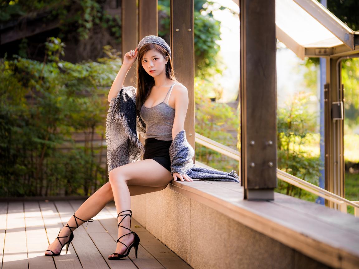 Обои Длинноногая азиатка сидит на окне