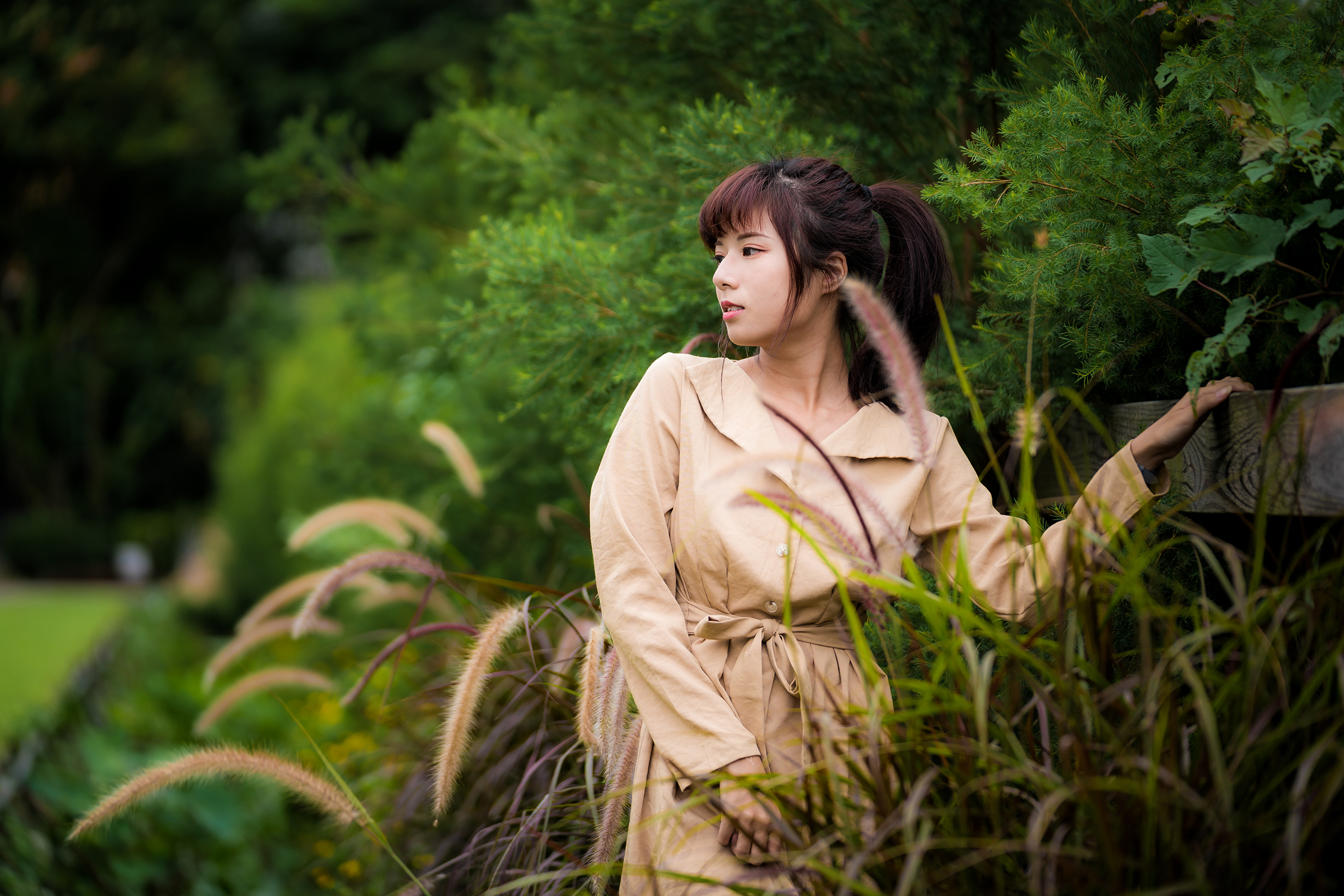 Обои Девушка азиатка в пальто сидит на траве