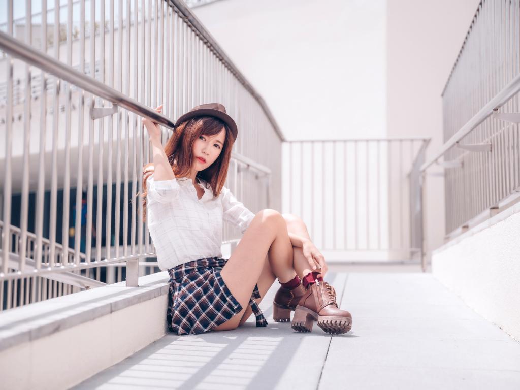 Обои Молодая азиатка в короткой юбке сидит у перил