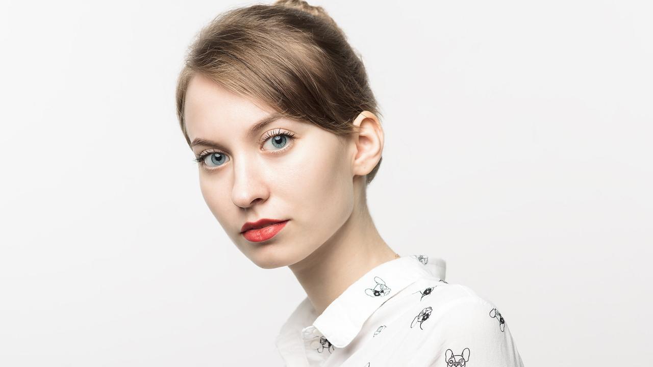 Обои Милая голубоглазая девушка в рубашке на сером фоне