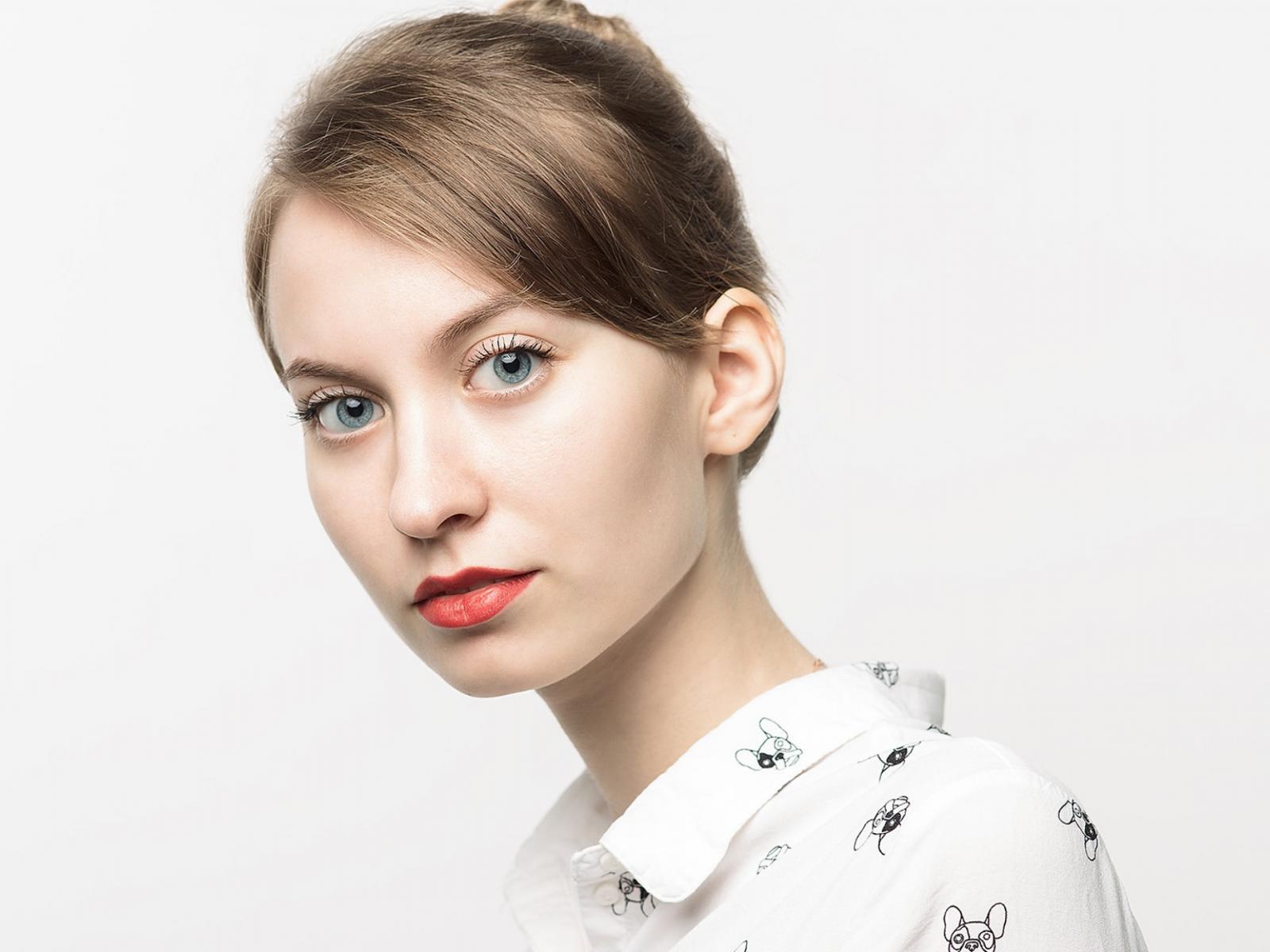 Обои Милая голубоглазая девушка в рубашке на сером фоне