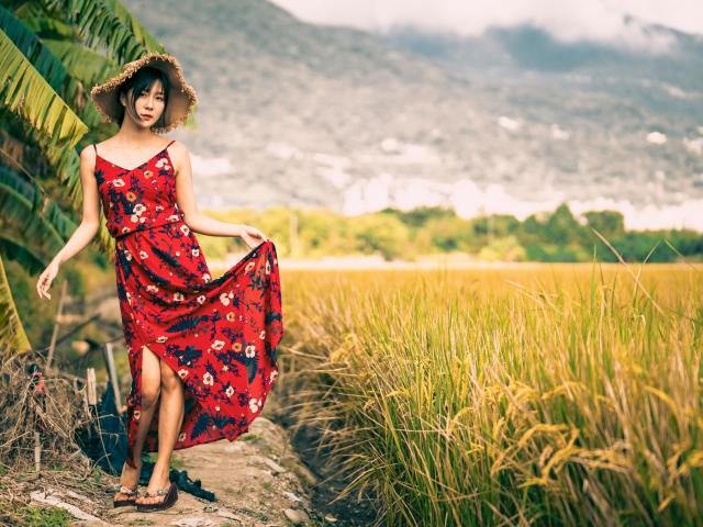 Обои Молодая азиатка в сарафане на рисовом поле