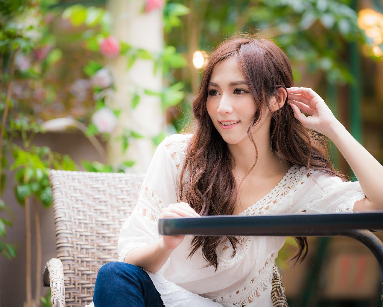 Обои Улыбающаяся девушка азиатка сидит за столом в кафе