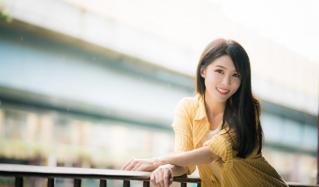 Обои Улыбающаяся азиатка в желтой полосатой рубашке