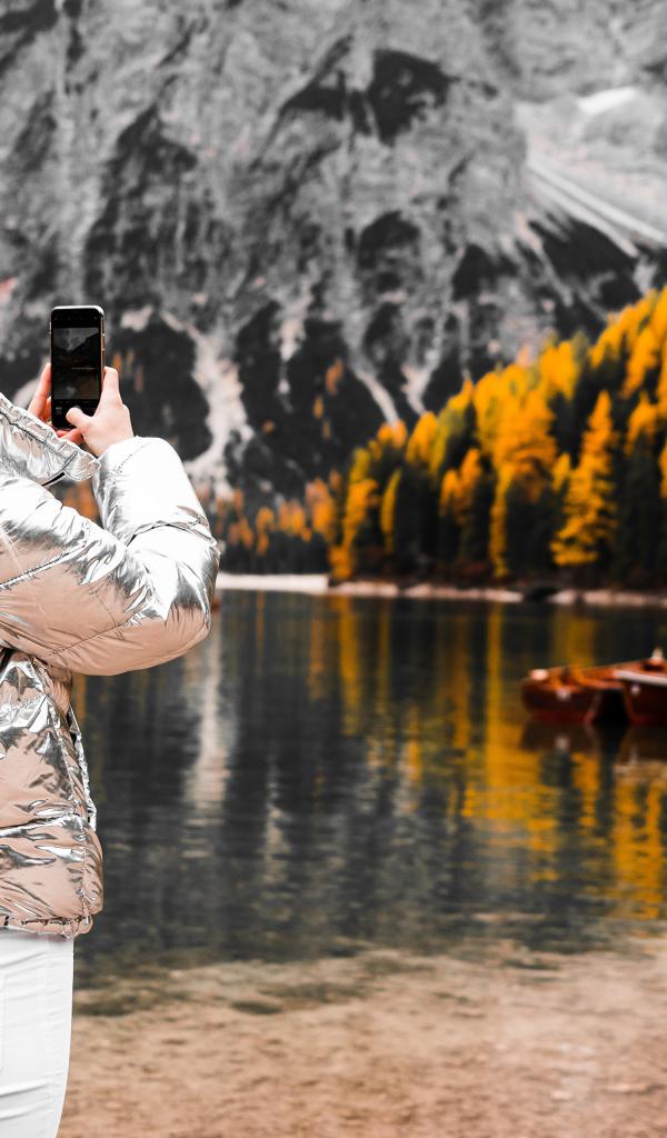 Обои Красивая девушка делает фото гор на телефон