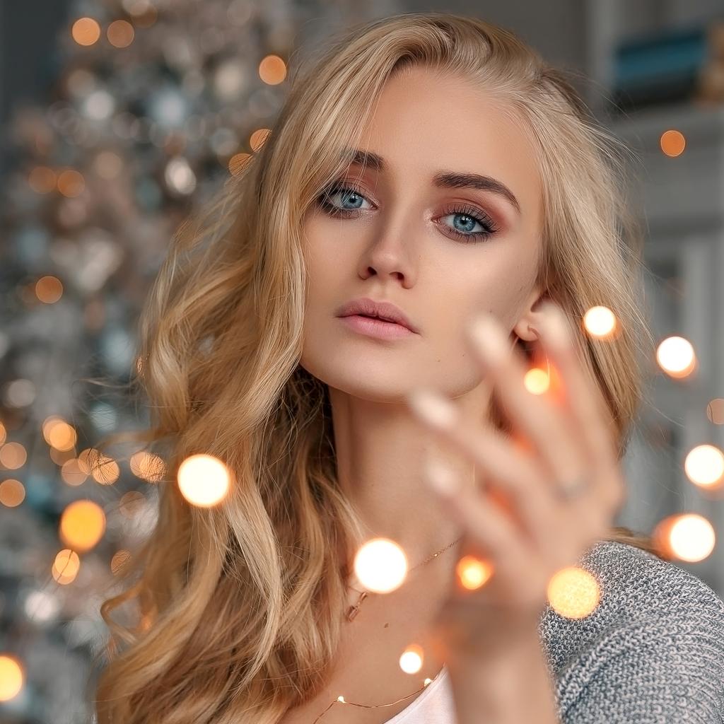 Обои Красивая голубоглазая блондинка с гирляндой в руке