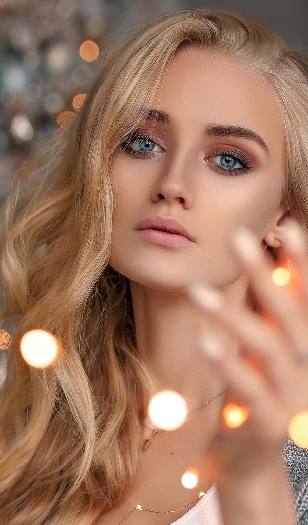 Обои Красивая голубоглазая блондинка с гирляндой в руке