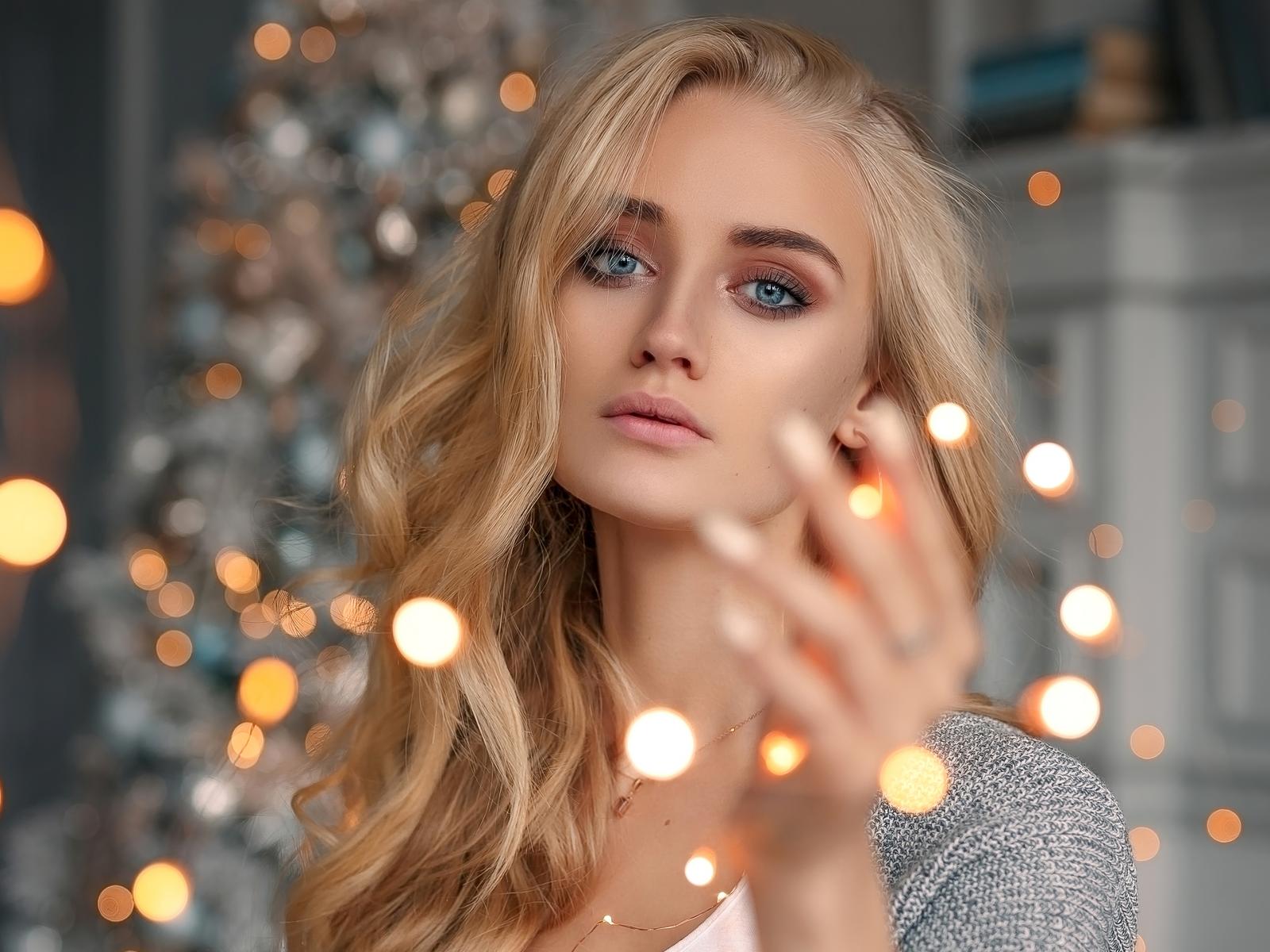 Обои Красивая голубоглазая блондинка с гирляндой в руке