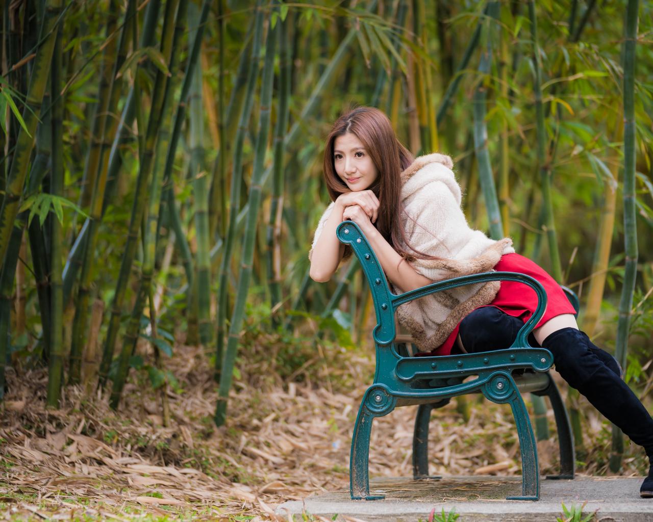 Обои Молодая девушка азиатка сидит на зеленой лавке