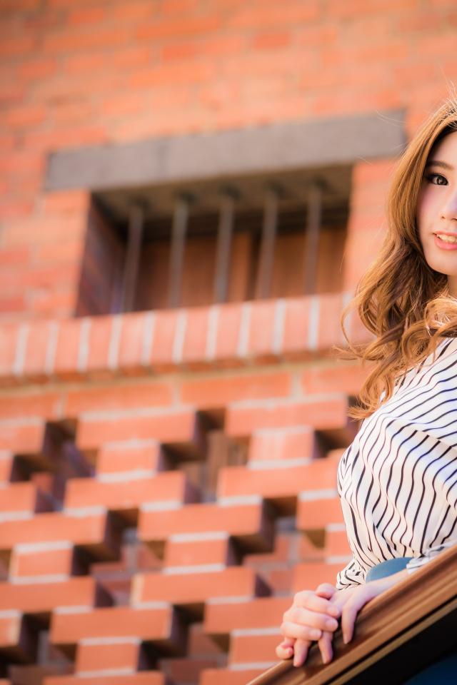 Обои Милая девушка в полосатой рубашке стоит на ступеньках