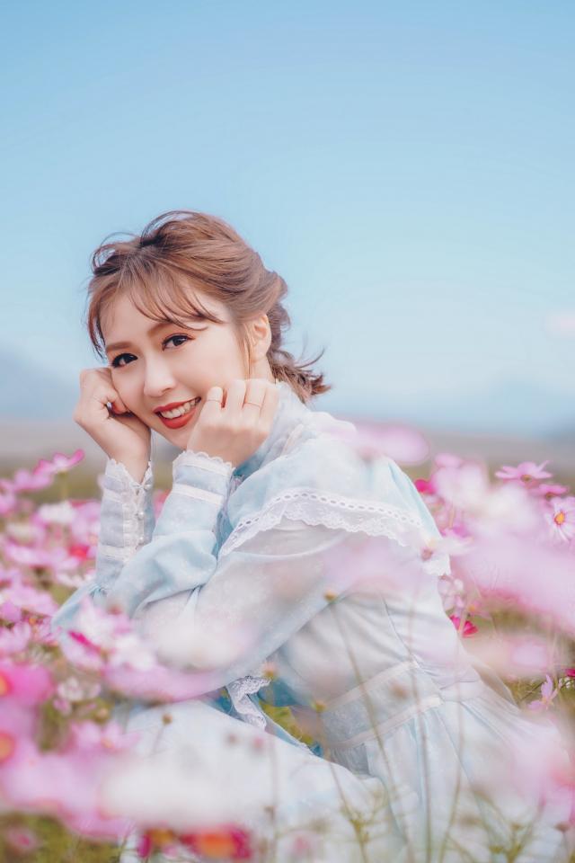 Обои Улыбающаяся девушка азиатка на поле с цветами космеи