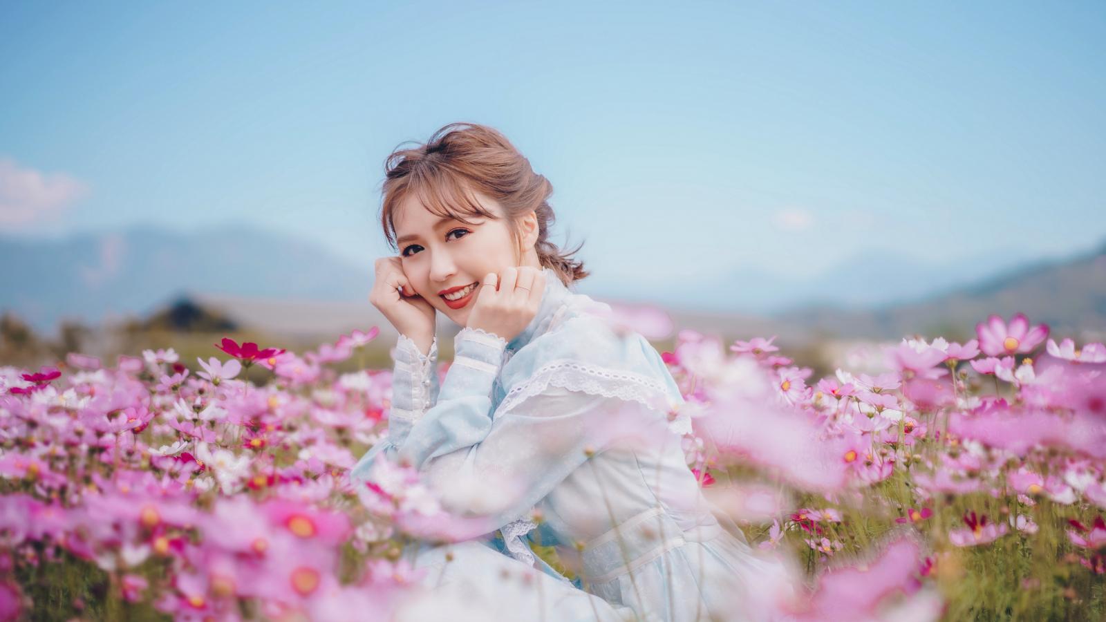 Обои Улыбающаяся девушка азиатка на поле с цветами космеи