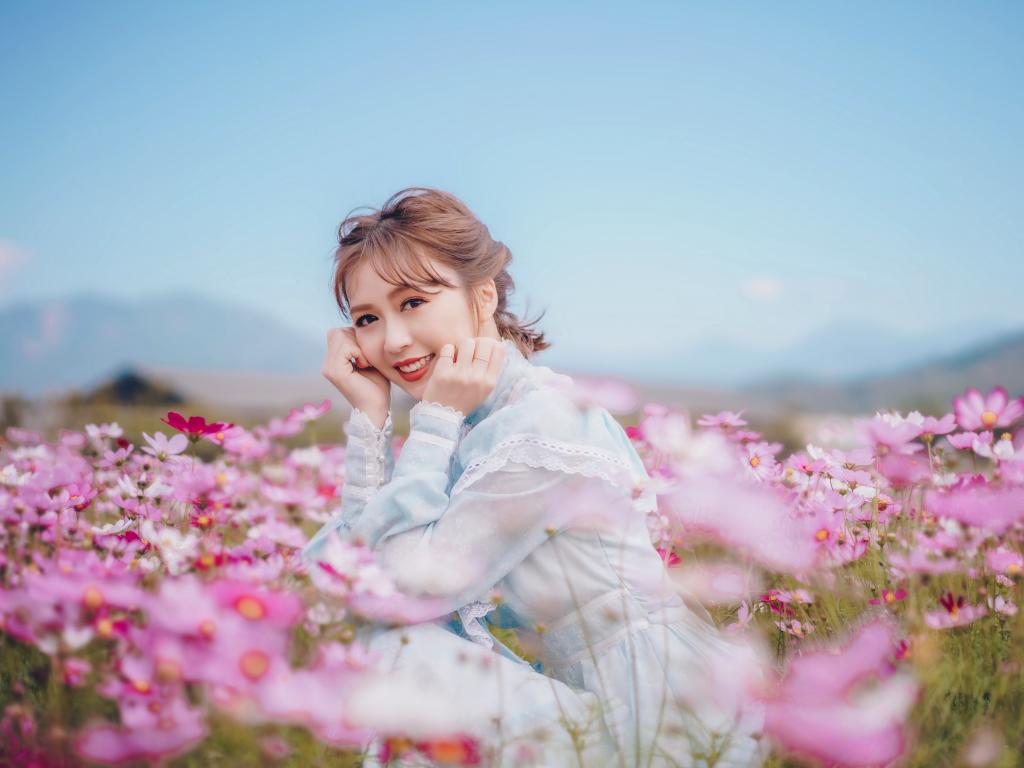 Обои Улыбающаяся девушка азиатка на поле с цветами космеи