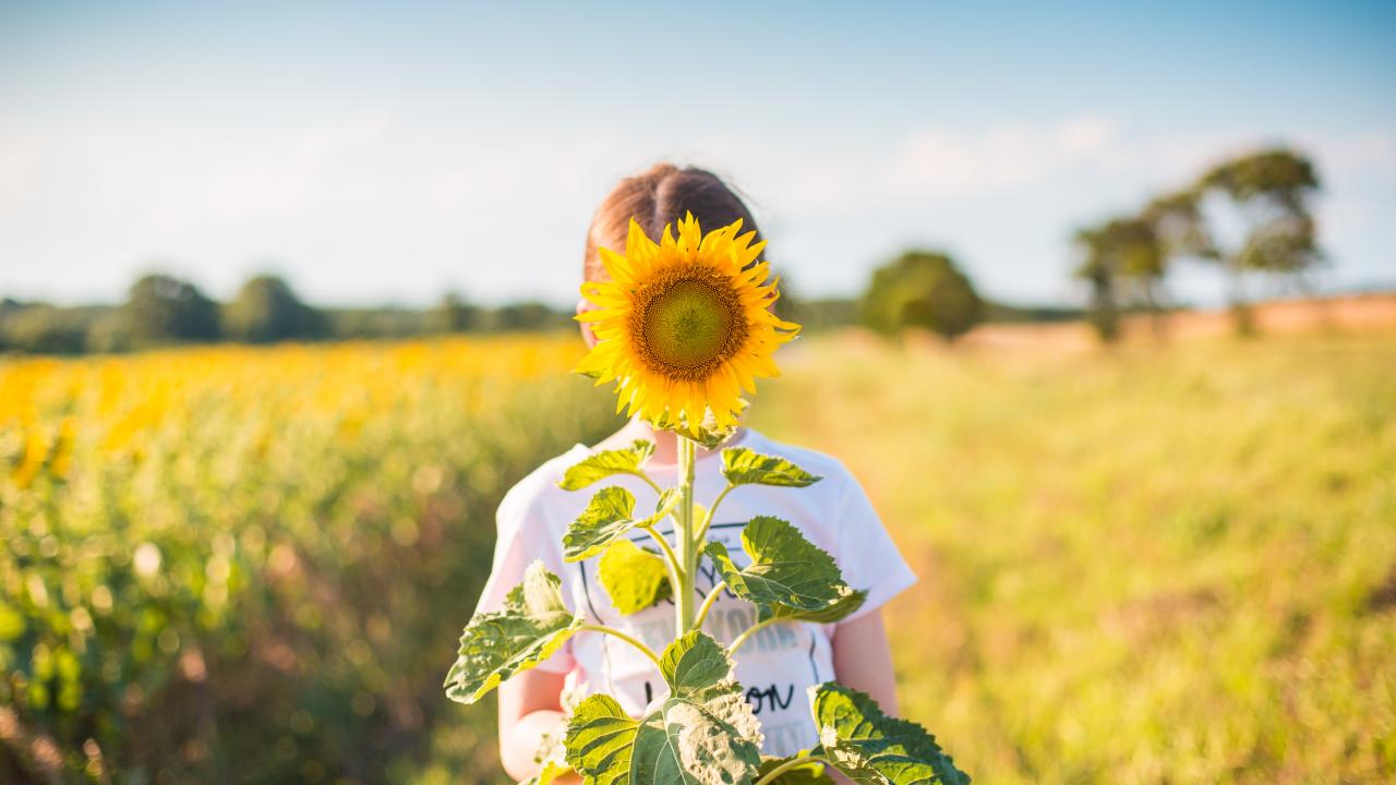 Обои Девушка прячется за цветком подсолнуха летом