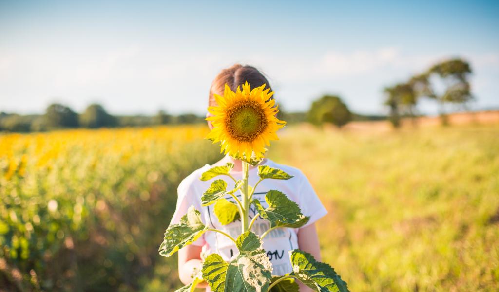 Обои Девушка прячется за цветком подсолнуха летом