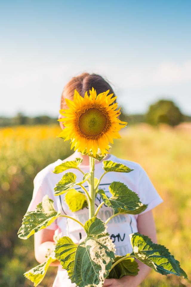 Обои Девушка прячется за цветком подсолнуха летом