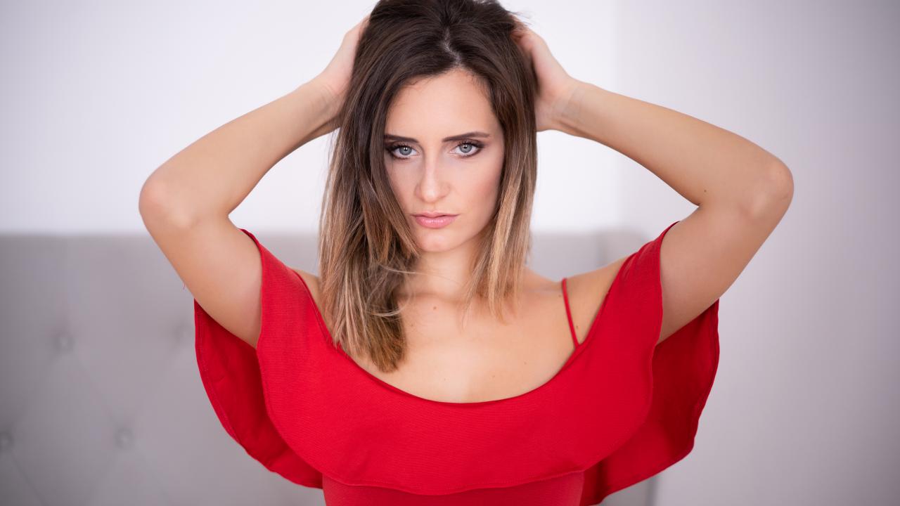 Обои Красивая девушка в красном платье с руками в волосах