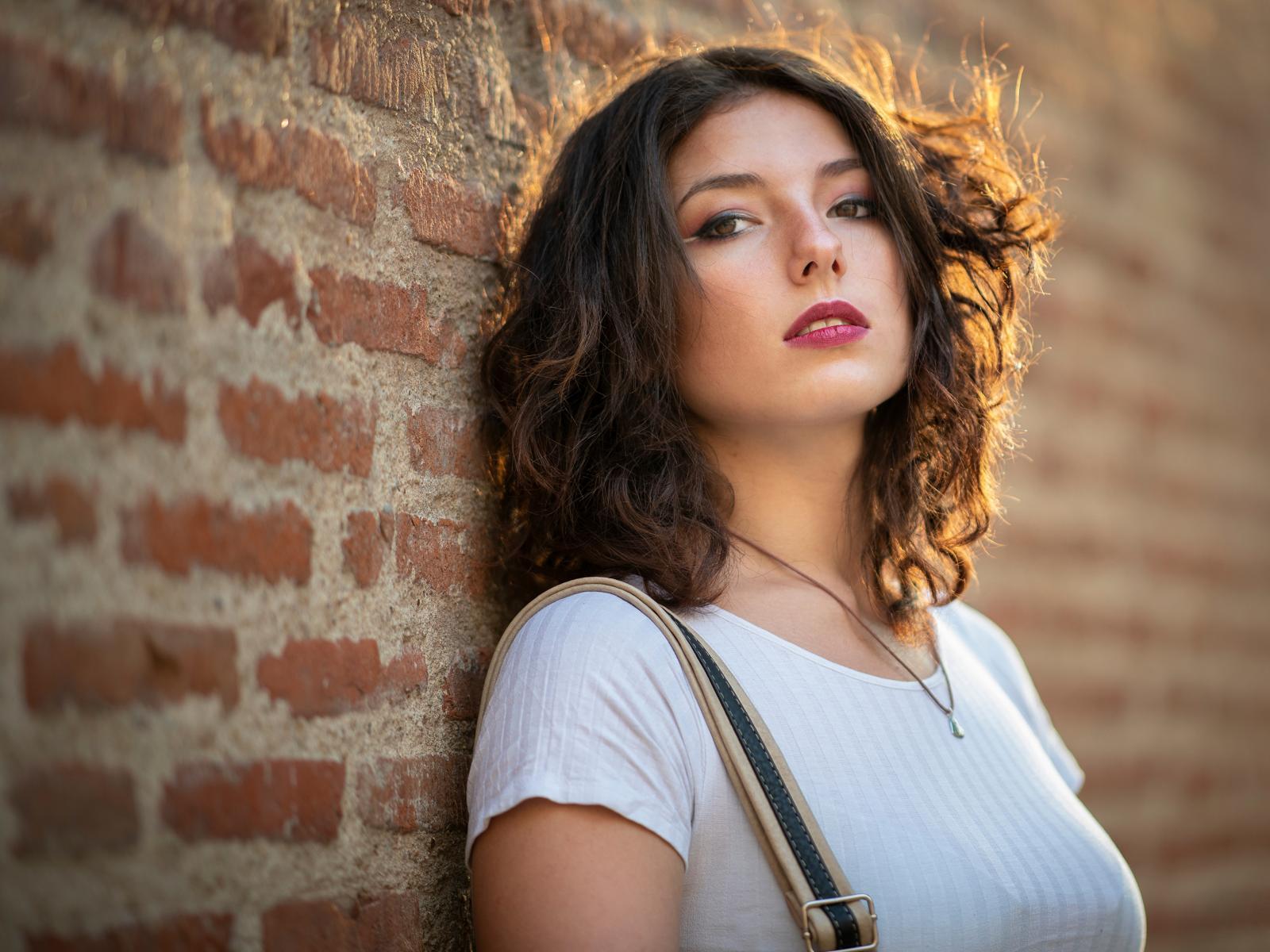 Обои Красивая девушка с серыми глазами стоит у кирпичной стены