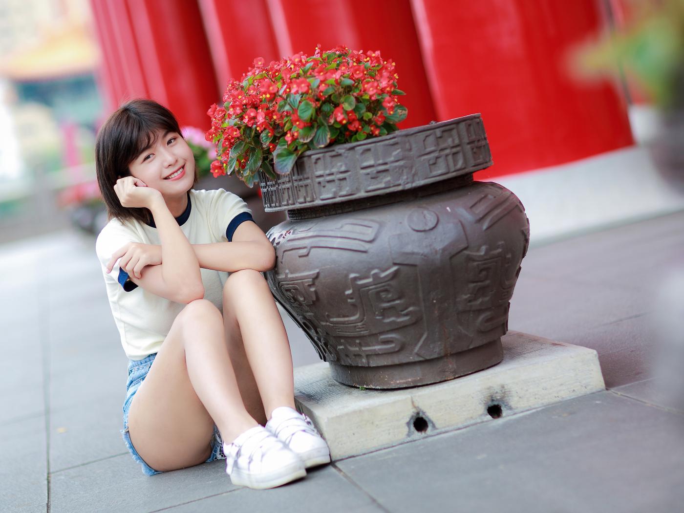 Обои Улыбающаяся азиатка сидит у клумбы с цветами