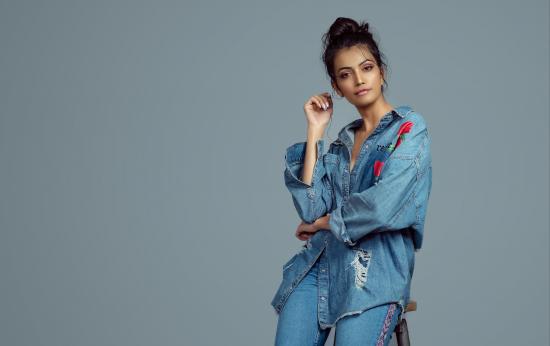 Обои Красивая девушка в джинсовом костюме на сером фоне