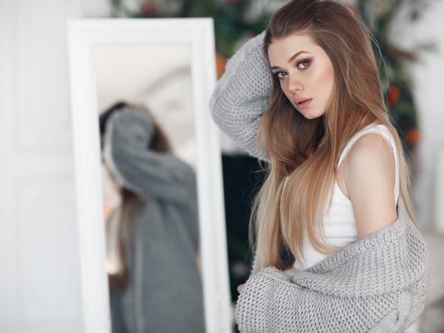 Обои Молодая девушка в серой кофте стоит у зеркала