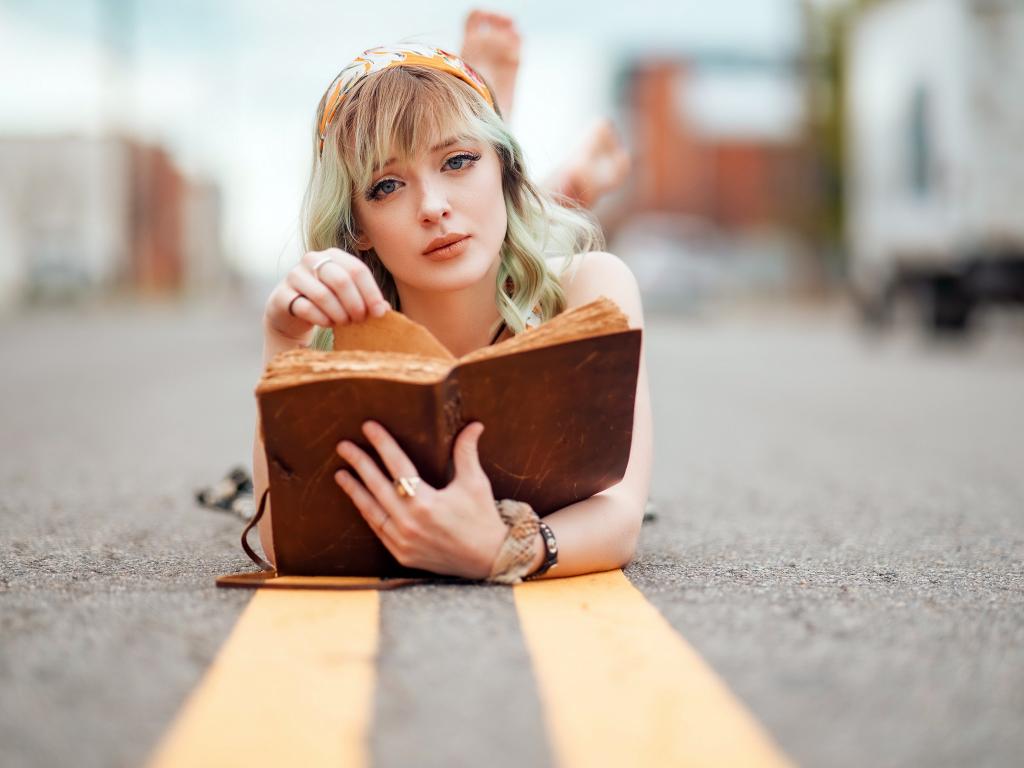Обои Милая блондинка лежит на асфальте с книгой