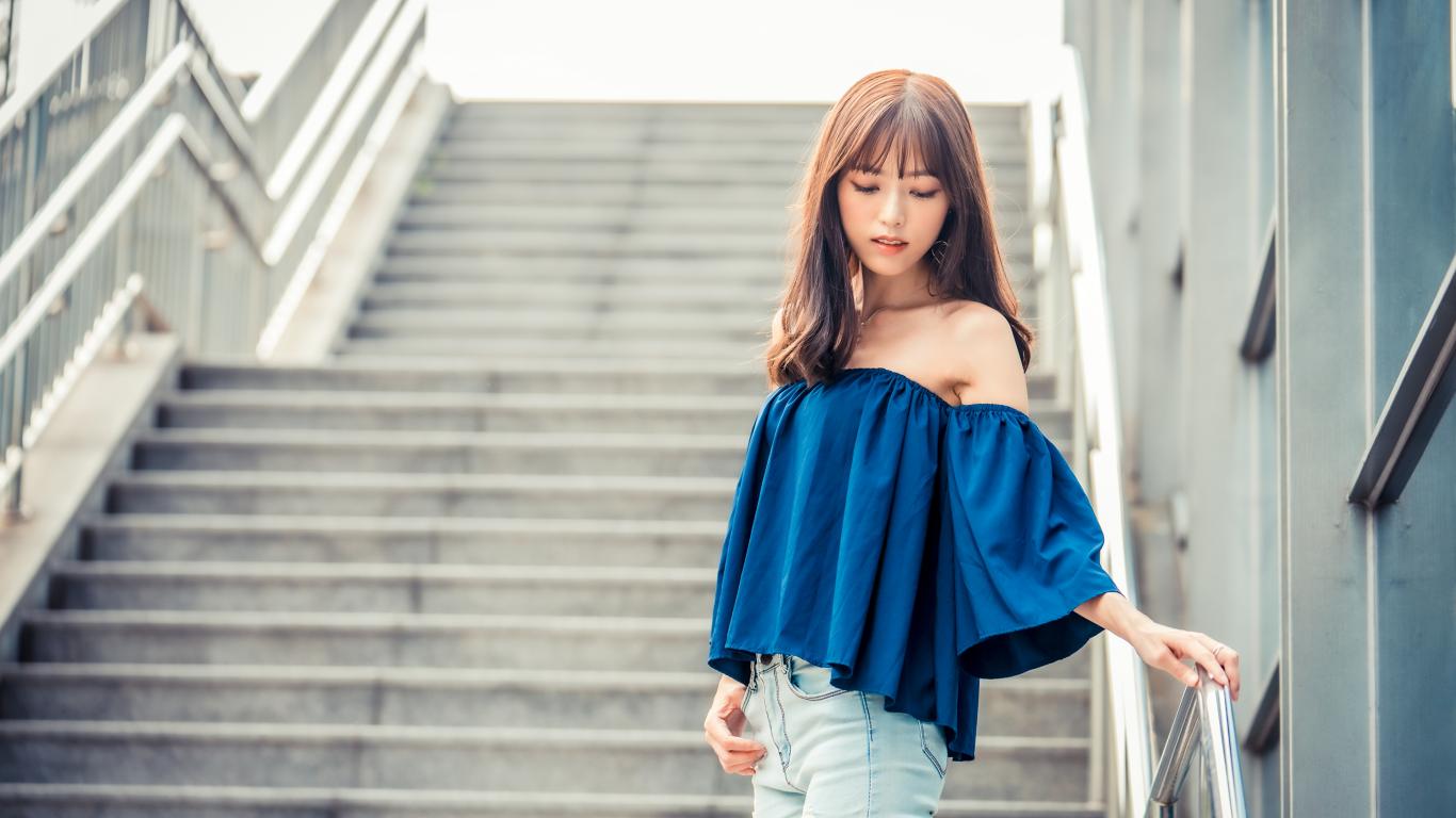Обои Стильная девушка азиатка с опущенной головой стоит на ступеньках