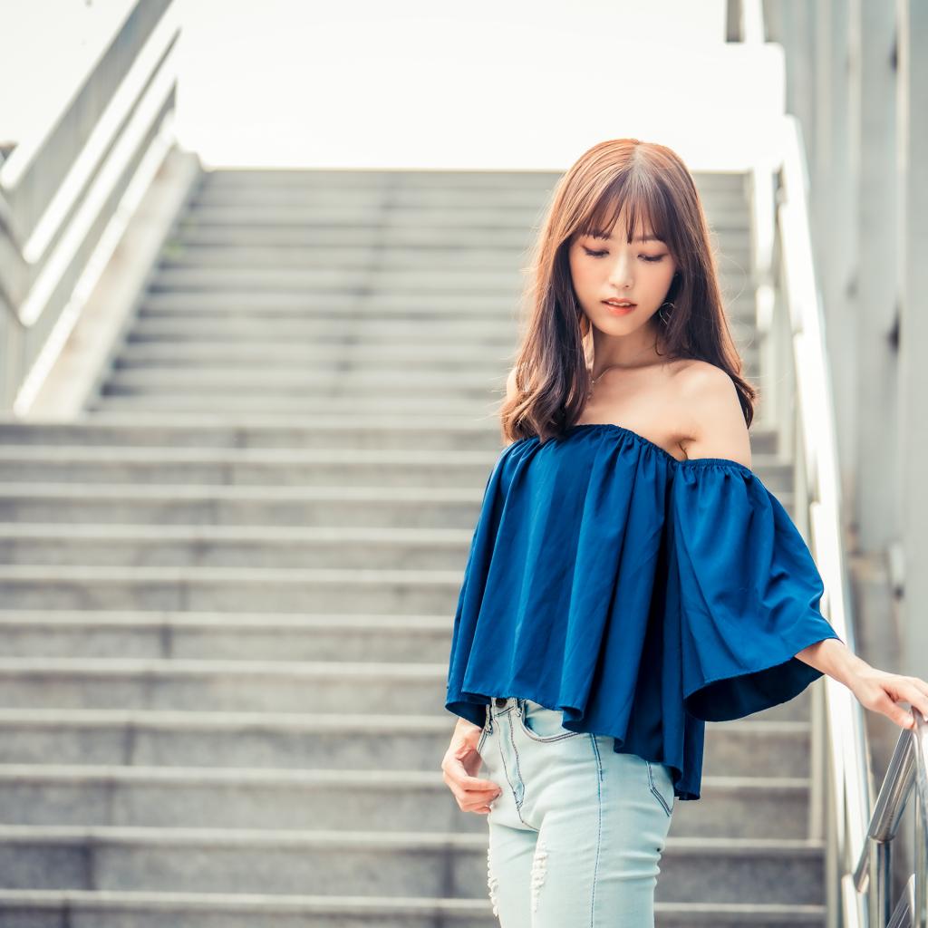 Обои Стильная девушка азиатка с опущенной головой стоит на ступеньках