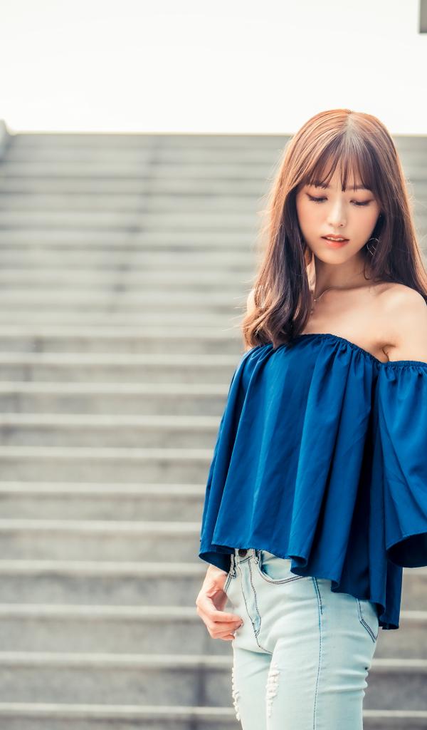 Обои Стильная девушка азиатка с опущенной головой стоит на ступеньках