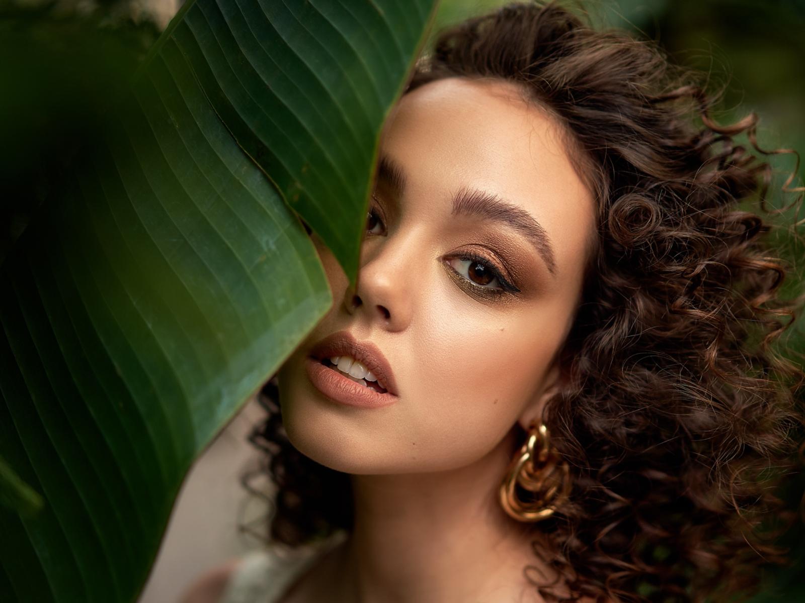 Обои Кареглазая кудрявая девушка стоит у большого зеленого листа