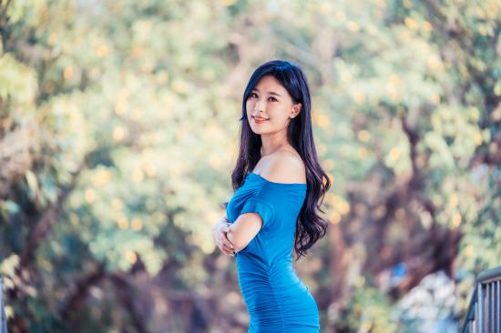 Обои Улыбающаяся девушка азиатка в голубом платье
