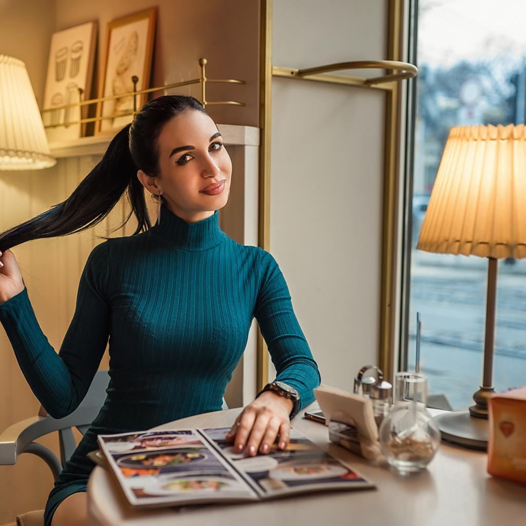 Обои Стильная девушка в платье сидит в кафе у окна