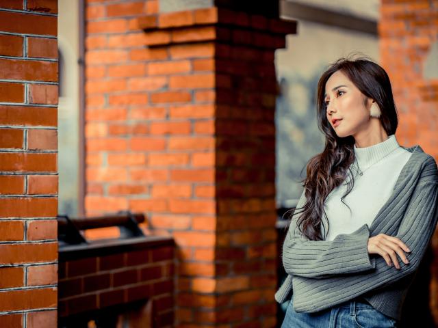 Обои Молодая девушка азиатка в серой кофте у кирпичной стены
