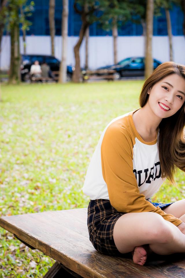 Обои Улыбающаяся девушка азиатка сидит на лавке в парке