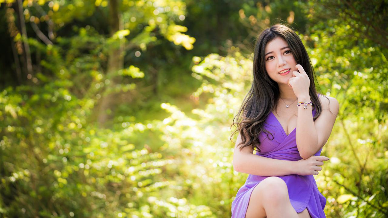 Обои Улыбающаяся девушка азиатка в фиолетовом платье сидит в парке