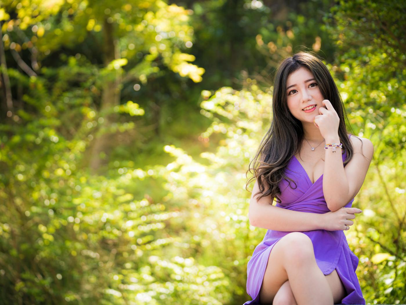 Обои Улыбающаяся девушка азиатка в фиолетовом платье сидит в парке