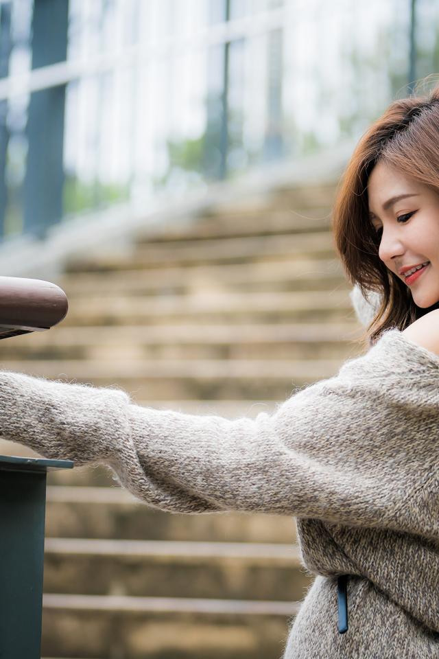 Обои Красивая девушка азиатка в сером свитере на ступеньках