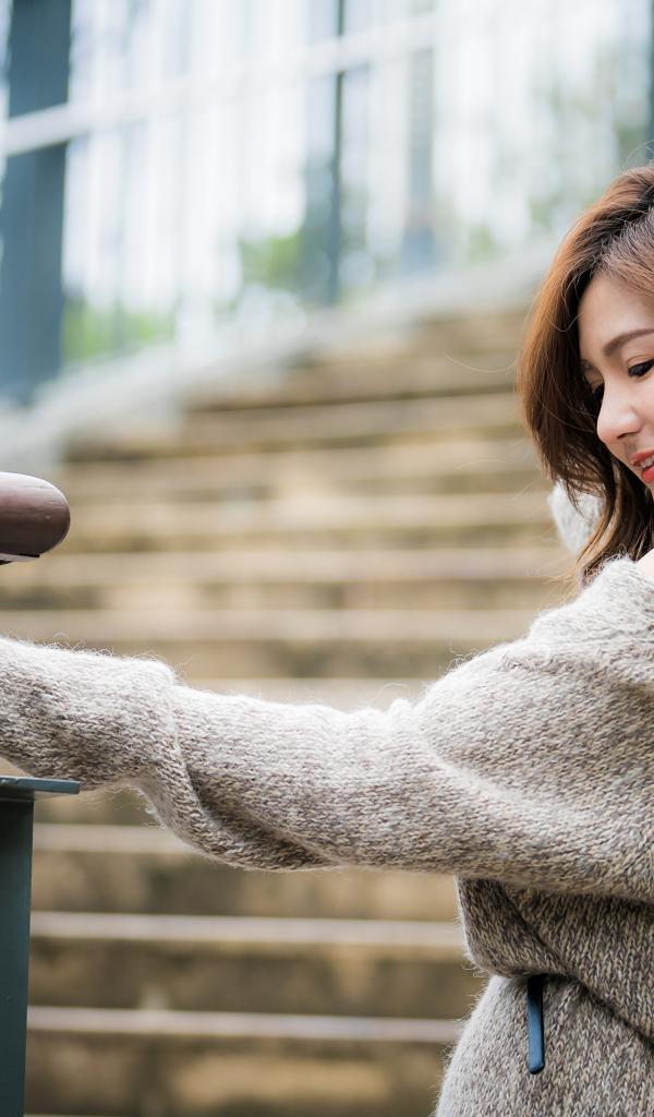 Обои Красивая девушка азиатка в сером свитере на ступеньках